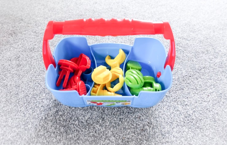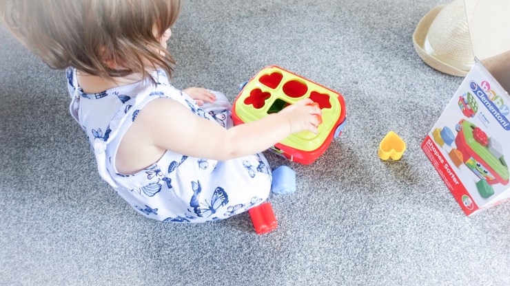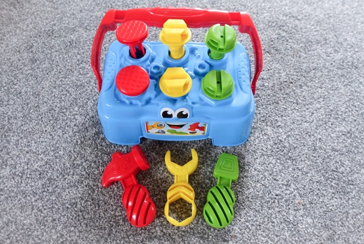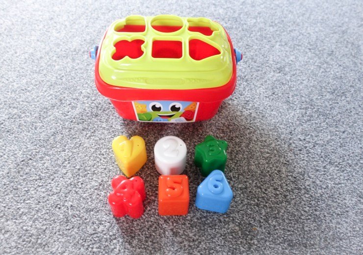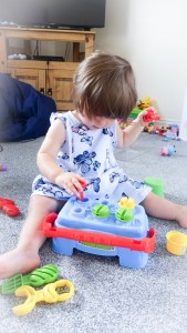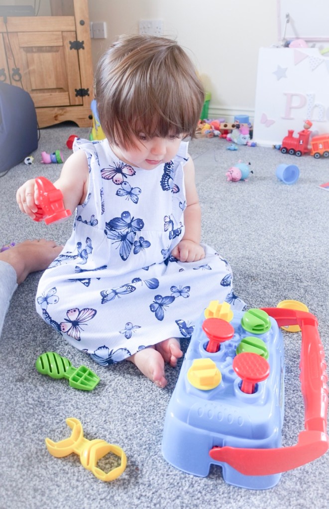 Phoebe noticed the toys straight away and want them out. So we have a shape sorter and a work bench!